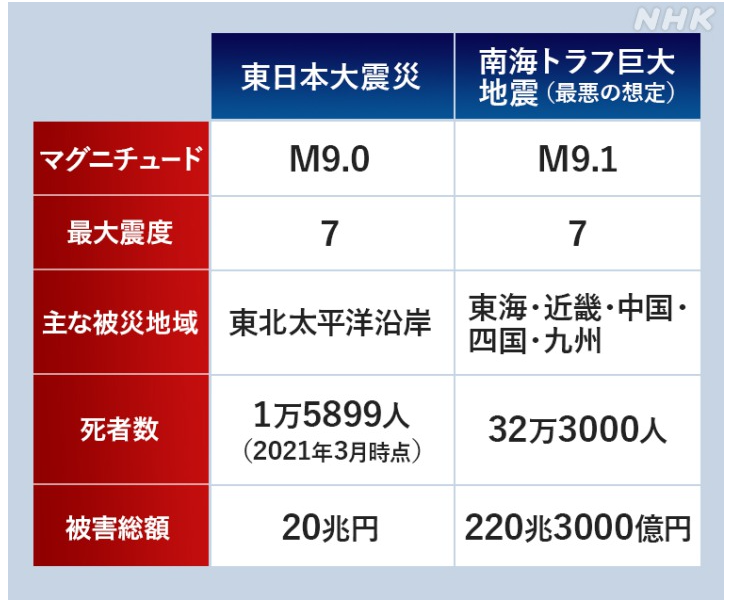 지도를 보면 짐작할 수 있다. 난카이 대지진이 발생하면 일본의 주력 산업과 공장, 주요 도시가 밀집한 환태평양 지역에 막대한 피해가 발생한다. 환태평양 지역에서는 일본 공산품 출하량의 70%를 차지하며 일본 인구가 가장 많이 밀집되어 있는 곳이다. 아래는 NHK 뉴스 기사의 이미지입니다. 동일본 대지진과 난카이 대지진을 비교한 표입니다. 난카이 대지진이라는 최악의 시나리오를 가정하면 사망자 32만3000명, 부상자 62만3000명, 피해액 220조3000억 엔(2023년 2월 7일 환율 기준 약 2092조 원)을 더한다. 그러나 일본토목학회는 전체 피해액을 1410조엔(약 3400조원)으로 추산하고 있다.