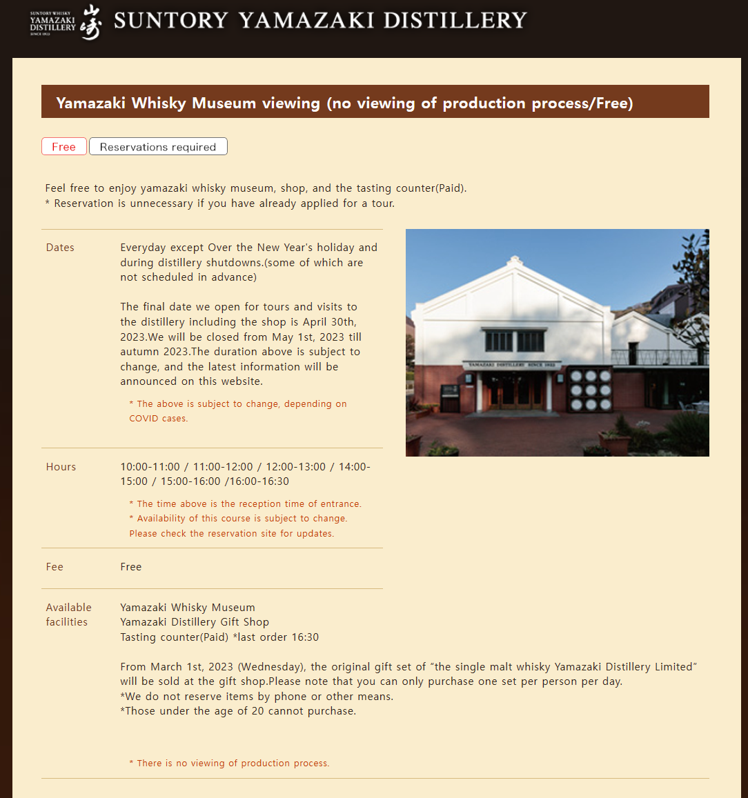5월 1일부터 2023년 가을까지까지 잠시 증류소 투어 없음내가 말하다.